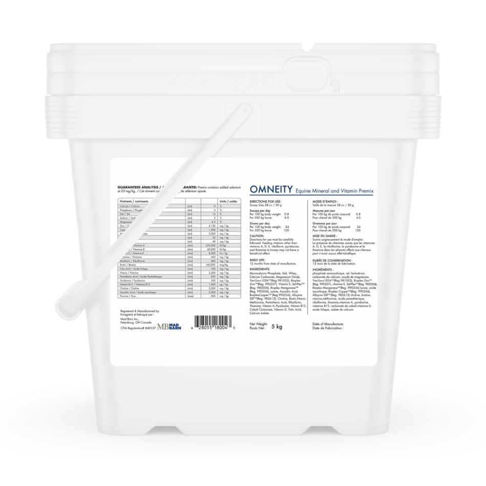 Omneity® Premix is an all-in-one equine vitamin and mineral supplement, expertly formulated with 100% organic trace minerals, B-vitamins, amino acids, digestive enzymes, and yeast. Gain confidence knowing your horse is getting everything they need with this complete, balanced formula. Save time and money while optimizing your horse’s diet: - An easy-to-feed powdered supplement offering complete flexibility - 20 mg of biotin for stronger hooves and a shiny coat - High-quality ingredients with no added grains, fillers or sugars